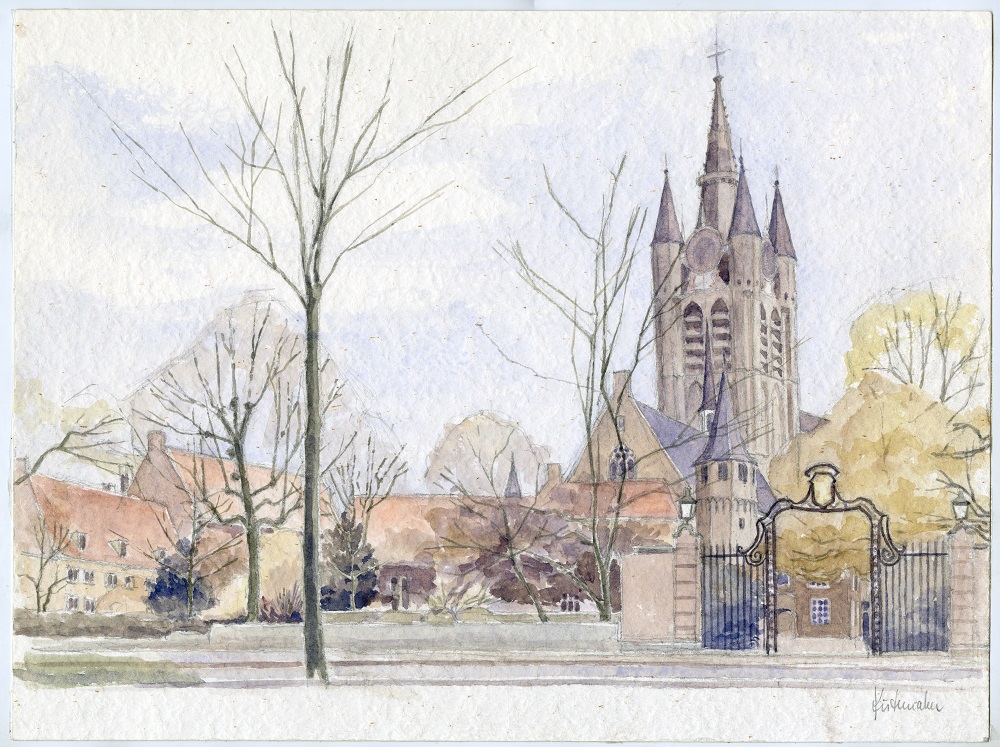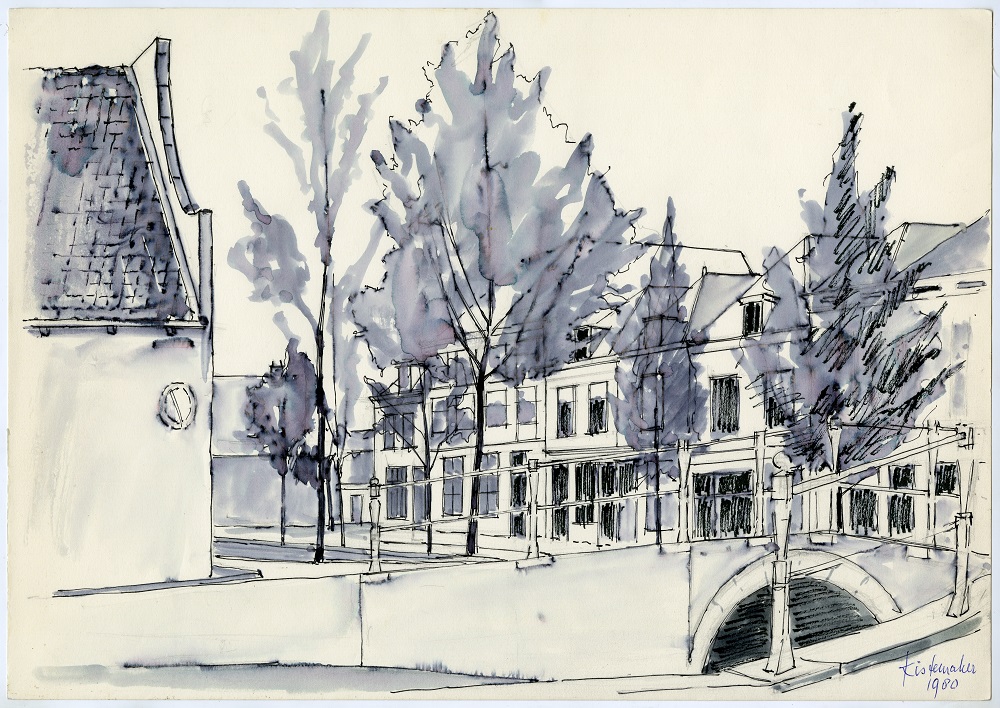 Onlangs kregen we bij het archief een mooie verzameling aquarellen. Allemaal van Delftse plekken en gebouwen. Deze prachtige aquarellen zijn gemaakt door de Delftenaar Jan Kistemaker (1918-2006). Een bekende naam, want Kistemaker was meer dan dertig jaar tekendocent op het Stanislas College in Delft. Het is wat minder bekend dat hij ook zelf veel schilderijen, aquarellen, etsen en tekeningen heeft gemaakt. Tijdens zijn leven heeft hij zijn werken nooit tentoongesteld. Zijn zoon, Geert Kistemaker, heeft besloten om een deel van zijn Delftse oeuvre te schenken aan het Stadsarchief. “Door te schenken geef ik een postuum eerbetoon aan zijn talent. Tijdens zijn leven heeft hij nooit zoveel aandacht en bewondering gekregen als nu”.
